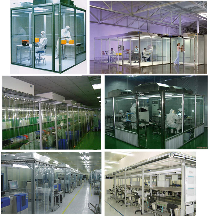 潔凈棚:采用工業(yè)鋁材(或不銹鋼方通、鐵方通噴塑)作為框架,風(fēng)機(jī)濾網(wǎng)機(jī)組(FFU)送風(fēng),四周懸掛防靜電垂簾(或鋼化玻璃),其內(nèi)部?jī)艋?jí)別可達(dá)到100~10000級(jí)。適用于操作區(qū)內(nèi)局部?jī)艋?jí)別要求高的區(qū)域。
